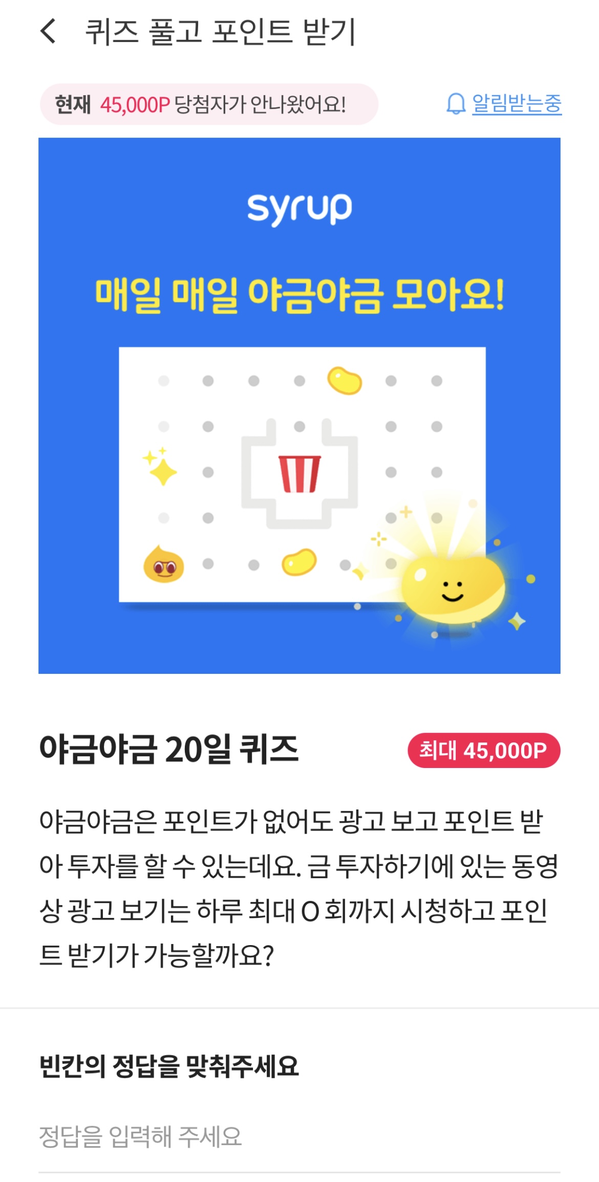 야금야금은 포인트가 없어도 광고 보고 포인트를 받아 투자를 할 수 있는데요. 금 투자하기에 있는 동영상 광고 보기는 하루 최대 0 회까지 시청하고 포인트 받기가 가능할까요?