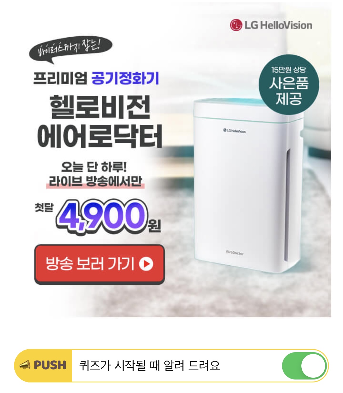 '프리미엄 공기정화기' 헬로비전 에어로닥터는 다양한 필터를 활용한 'OOO' 공기정화 시스템으로 바이러스, 유해물질을 제거한다. 'OOO'에 들어갈 단어는 무엇일까요?