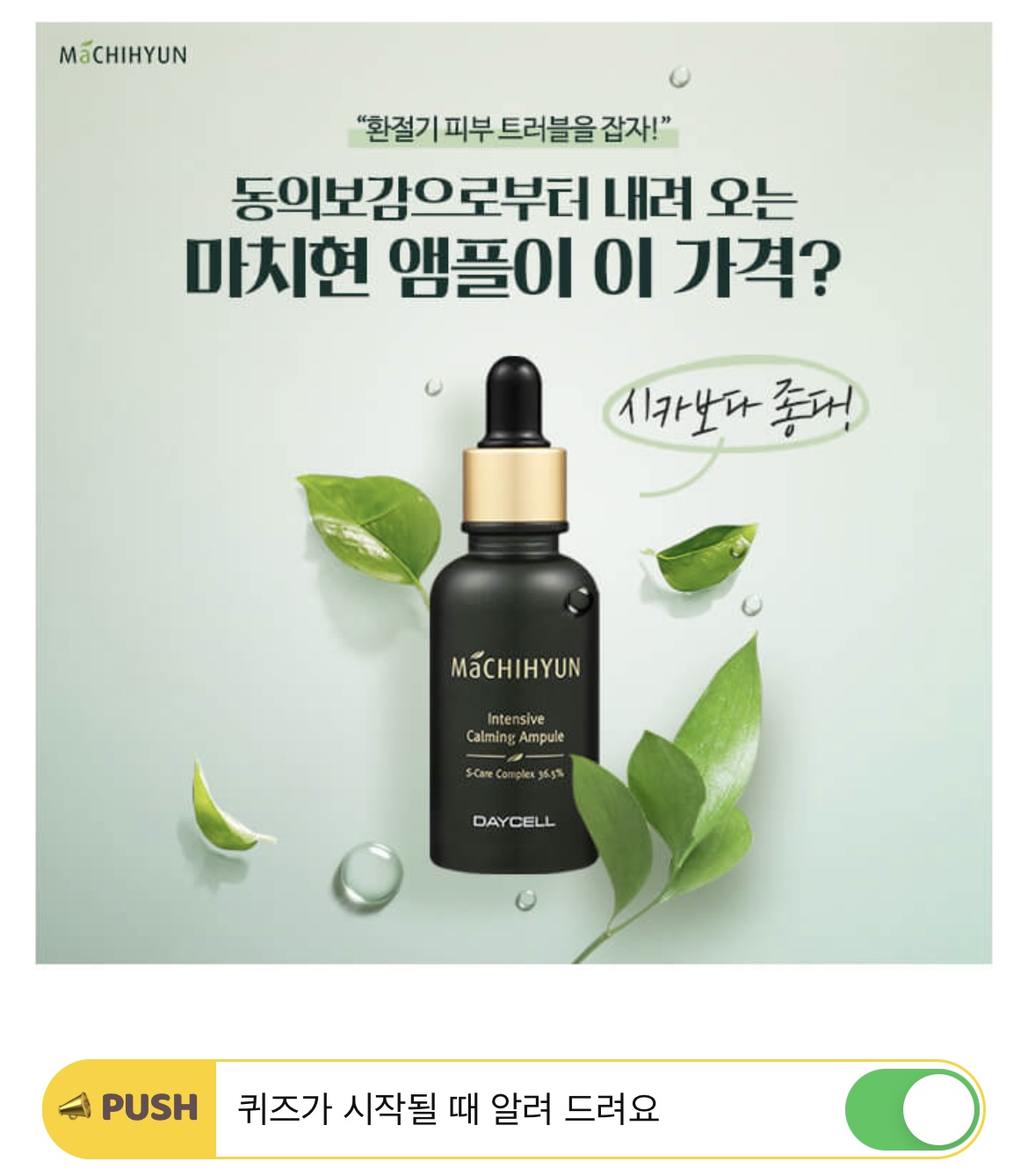 마치현은 전성분 EWG그린등급과 20가지 유해의심성분 무첨가로 민감한 당신의 피부를 위한 OOOO를 실현하고 있습니다. OOOO에 들어갈 단어는 무엇일까요? (초성힌트 : ㅋㄹㅂㅌ)
