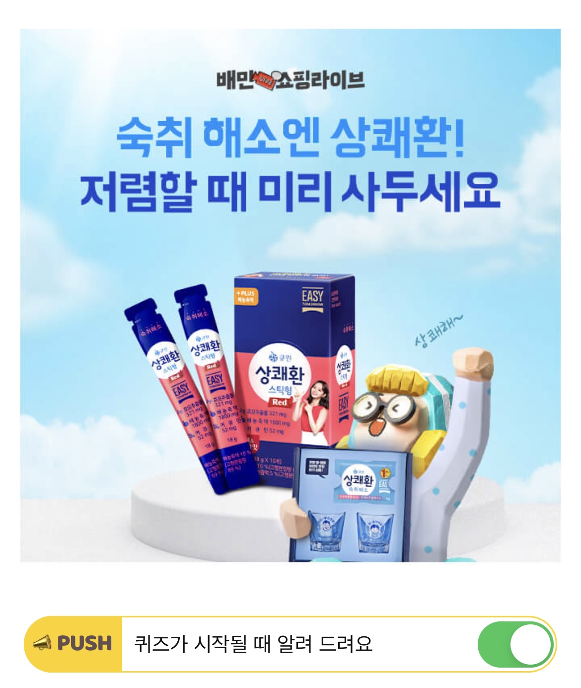 숙취해소의 대명사 상쾌환에서 신제품이 나왔어요! 신제품 출시 기념 오늘은 OO% 할인 방송을 진행합니다! OO에 들어갈 숫자는 무엇일까요?