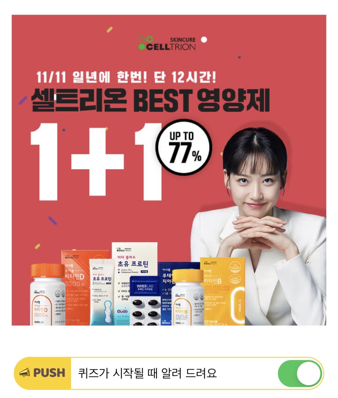 ★11/11 일년에 단한번 특가!★ 우리 몸이 요구하는 필요량만큼 충분히 흡수 후 사용되고 남은 양은 체외로 배출되는 비타민C가 셀트리온 이너랩 상큼한 츄어블 비타민C 500에는 1일 영양성분 기준치 대비 OOO% 함유되었습니다. OOO에 들어갈 숫자는 무엇일까요?