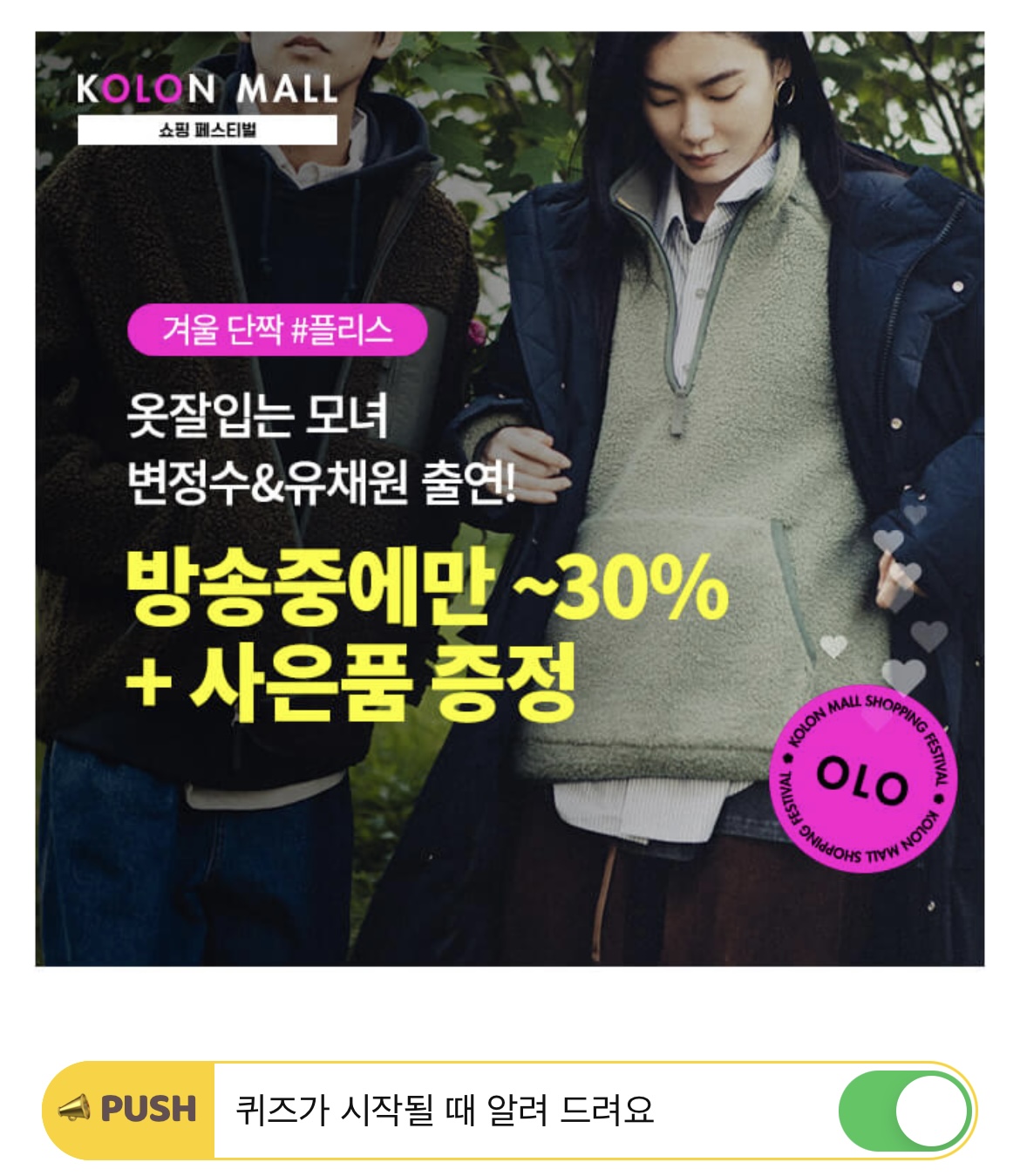 친구같은 모녀, 변정수&유채원과 함께하는 코오롱몰 쇼핑 페스티벌 라이브에서 방송 중 꿀 혜택을 지금 확인하세요 (초성힌트: ㅎㅇㄷㅇㅇ)