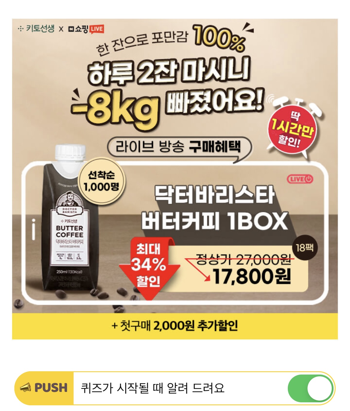 "68kg 최고 몸무게 찍고 꾸준히 마셨습니다. 4회차 구매하고 총 -13kg 감량해서 비만 탈출했습니다!" 이 내용은 쇼핑라이브 방송 OOO만에 1,000박스가 완판된 닥터바리스타 후기입니다.