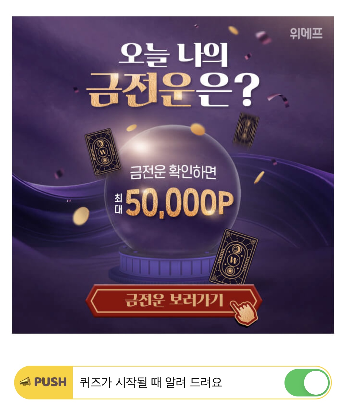 위메프 금전운 포인트에 당첨되기 위해선 금전운 OO를 선택해야 합니다. OO에 들어갈 단어는 무엇일까요? (힌트 : ㅋㄷ)