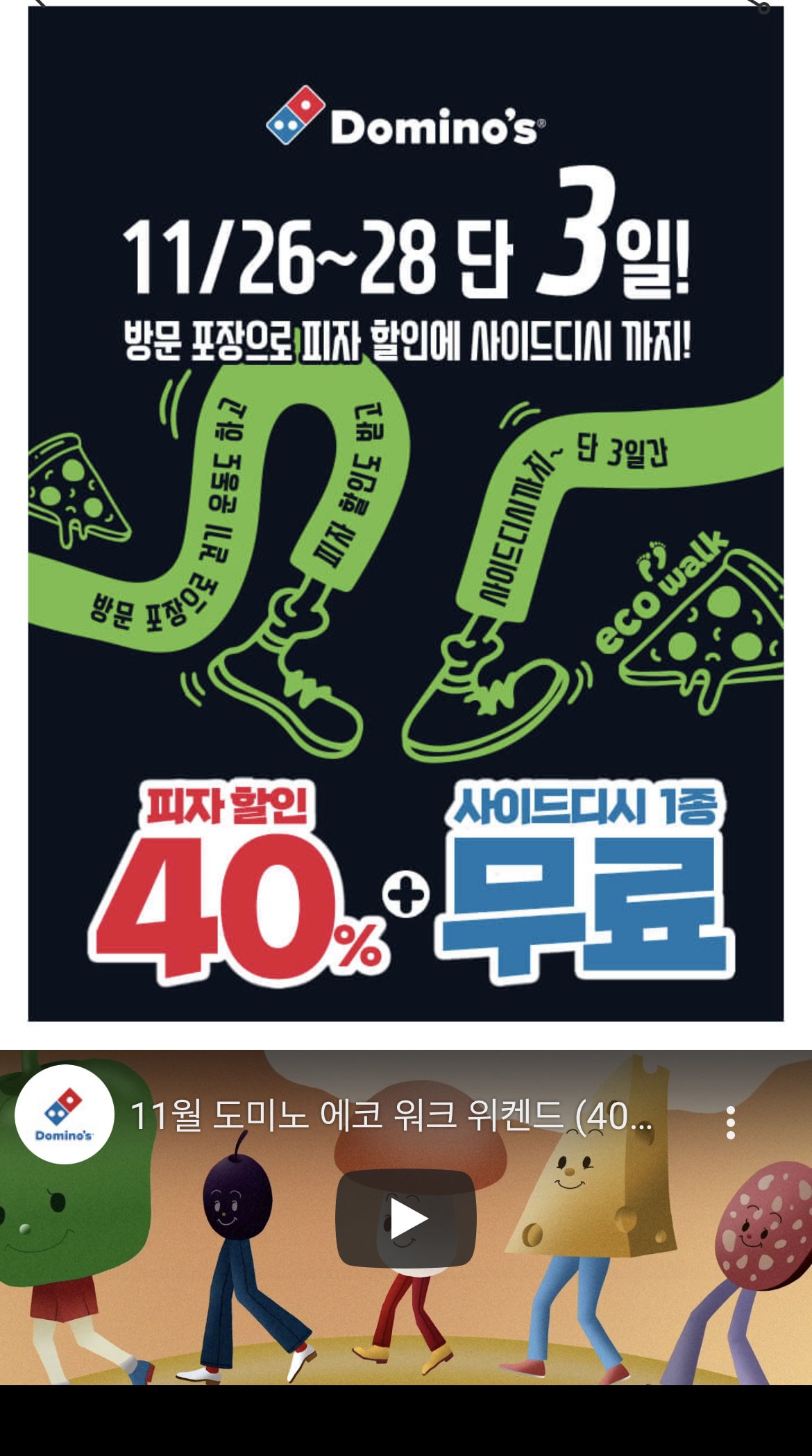 도미노 에코 워크 위켄드는 방문포장 하고 걷기 운동하면 무려 피자 40% 할인에 사이드디시 1종을 무료로 받을 수 있는 프로모션 입니다.
