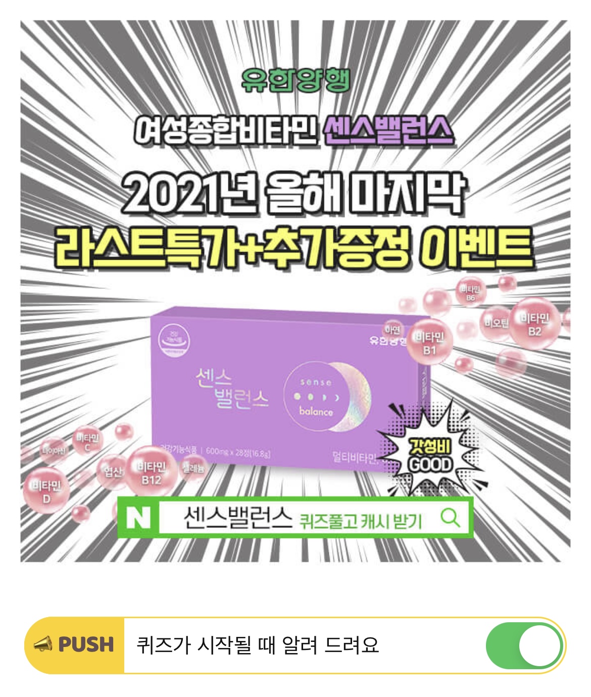누적리뷰만 8000건이 넘는 유한양행에서 만든 여성멀티비타민 센스밸런스에는 권장기준치 100% 기준대비 8,333%의 비타민OOO함유되어있다. OOO에 들어갈 영어+숫자는 무엇일까요 ?