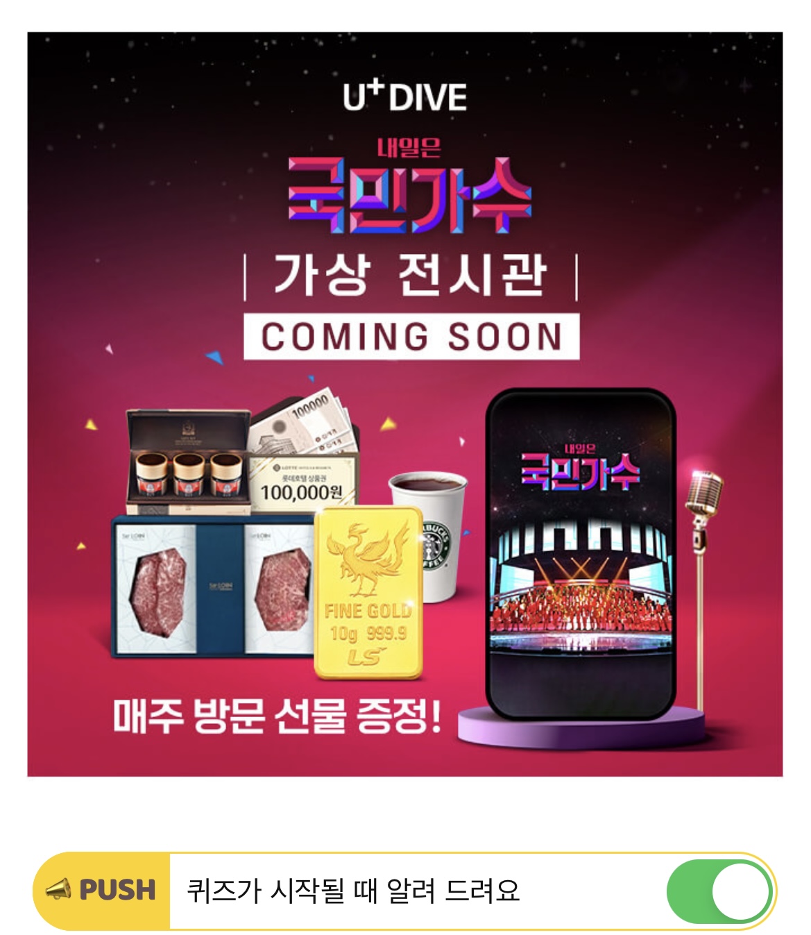 U+DIVE 앱에서는 순금, 한우 경품을 받을 수 있는 "내일은 국민가수" 전시관 이벤트가 OO/OO까지 진행됩니다. 여기서 OOOO에 들어갈 숫자는 무엇일까요?