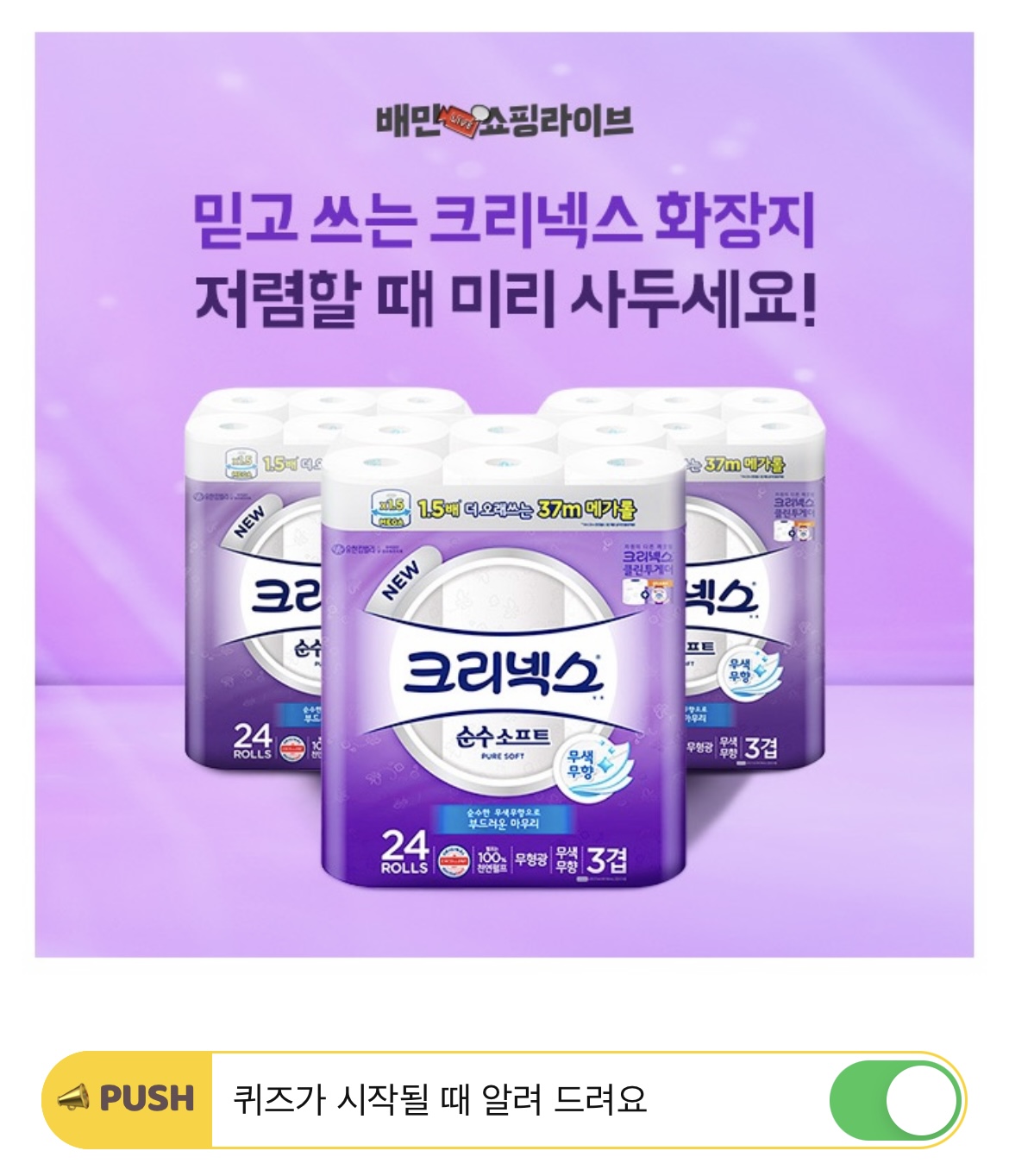 믿고 쓰는 유한킴벌리 크리넥스 화장지! 오늘 배민쇼핑라이브에서 최대 OO% 할인 합니다. OO에 들어갈 숫자는 얼마일까요?