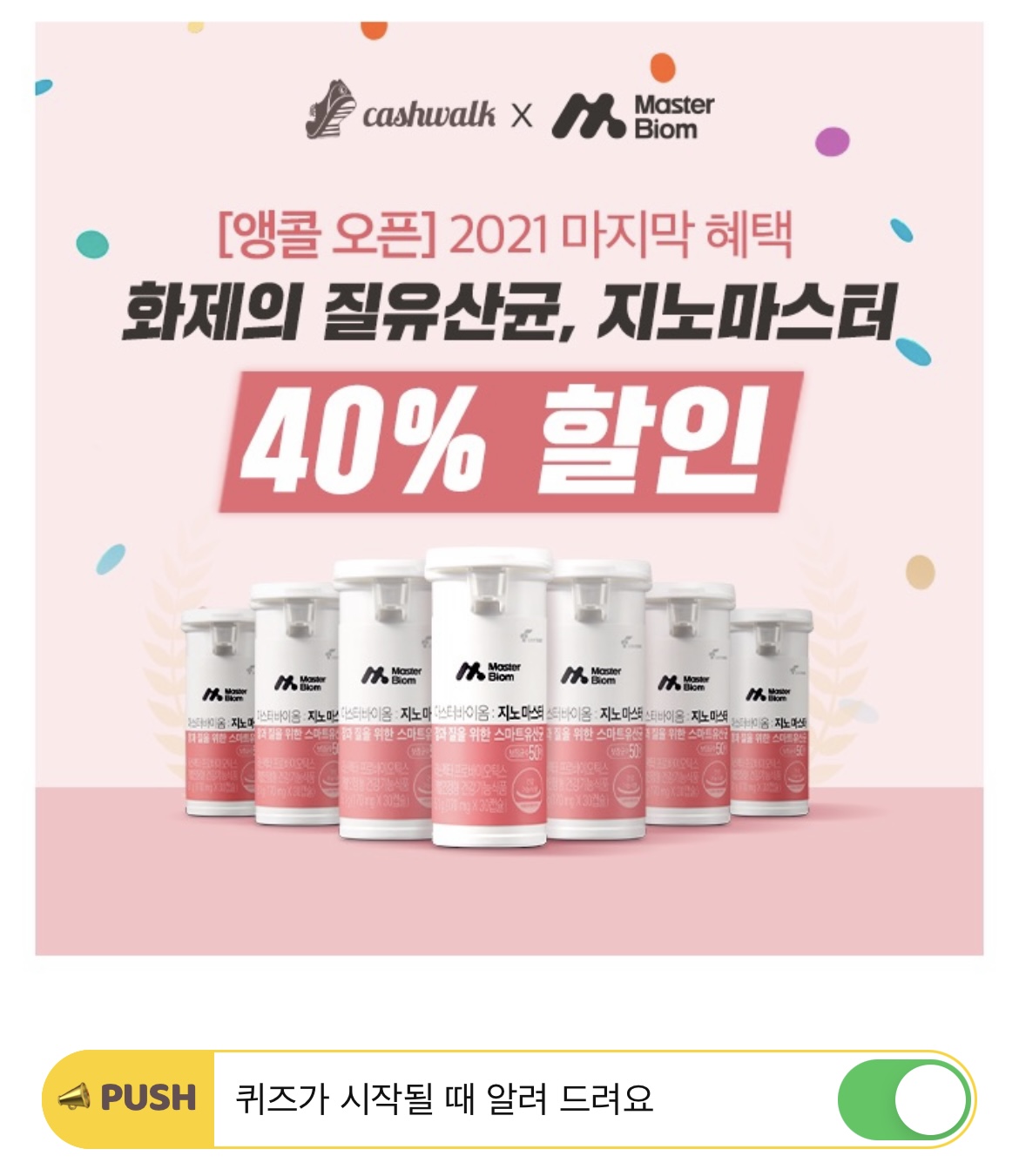 여성 질유산균 지노마스터는 론칭 1주년을 기념하여, 역대급 할인 + 무료체험 OO일 이벤트를 진행하고 있는데요. 질염현상 개선기간이기도 한 OO일, 빈칸에 들어갈 숫자는 무엇일까요?