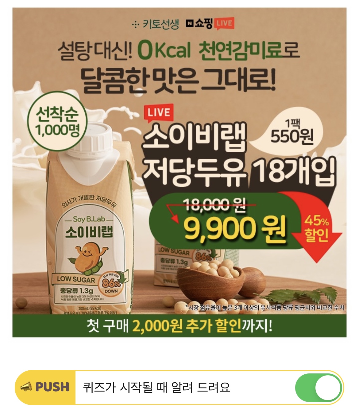 "설탕있는 두유 마시다가 바꿨는데 일주일만에 63kg -> 60kg으로 -3kg 줄었네요 몸이 가벼워졌어요!" 이 내용은 라이브 OO연속 매진된 소이비랩 저당두유 후기인데요, 설탕 대신 0kcal 천연감미료를 사용해 단맛은 그대로 살리면서도 당류는 타사대비 86% 낮췄습니다