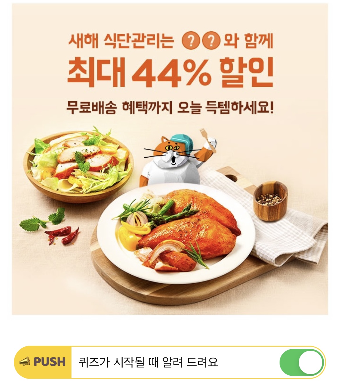 오늘 배민쇼핑라이브에서는 OO닭가슴살 상품을 최대 44% 할인 중! 소스가 맛있는 닭가슴살부터 만두, 스테이크까지 다양하게 준비했는데요. OO에 들어갈 브랜드 이름은 무엇일까요?
