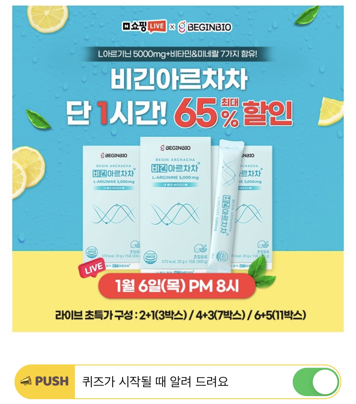 새콤달콤한 레몬맛으로 남녀노소 섭취하기 좋은 맛있는 아르기닌! 비긴 OOOO에 들어갈 단어는 무엇일까요? (초성힌트 : ㅇㄹㅊㅊ)