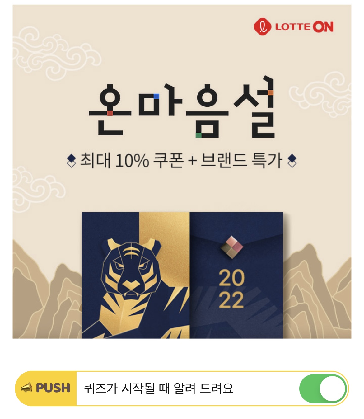 1월 13일부터 1월 16일까지 롯데ON OOO 설 쿠폰 최대 10% 할인 쿠폰을 드립니다. OOO에 들어갈 단어는 무엇일까요?
