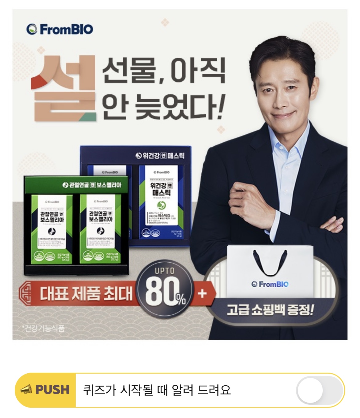 이병헌이 추천하는 관절연골엔 OOOOO. 관절은 건강하게! 부모님 어깨는 쭈욱~ 관절 및 연골 건강에 도움을 줄 수 있는 관절연골엔 OOOOO. OOOOO는 무엇일까요? (힌트 : ㅂㅅㅇㄹㅇ)