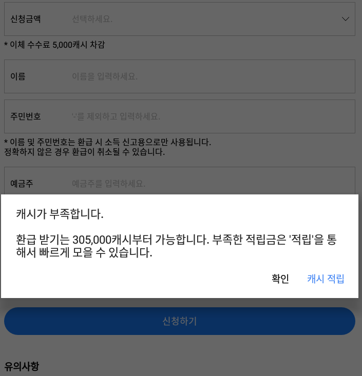 현금 받기는 305,000 캐시부터 가능합니다. 부족한 적립금은 '적립'을 통해서 빠르게 모을 수 있습니다.