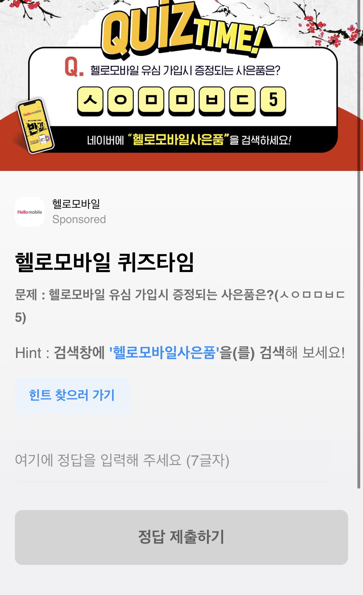 문제 : 헬로모바일 유심 가입시 증정되는 사은품은?(ㅅㅇㅁㅁㅂㄷ5)