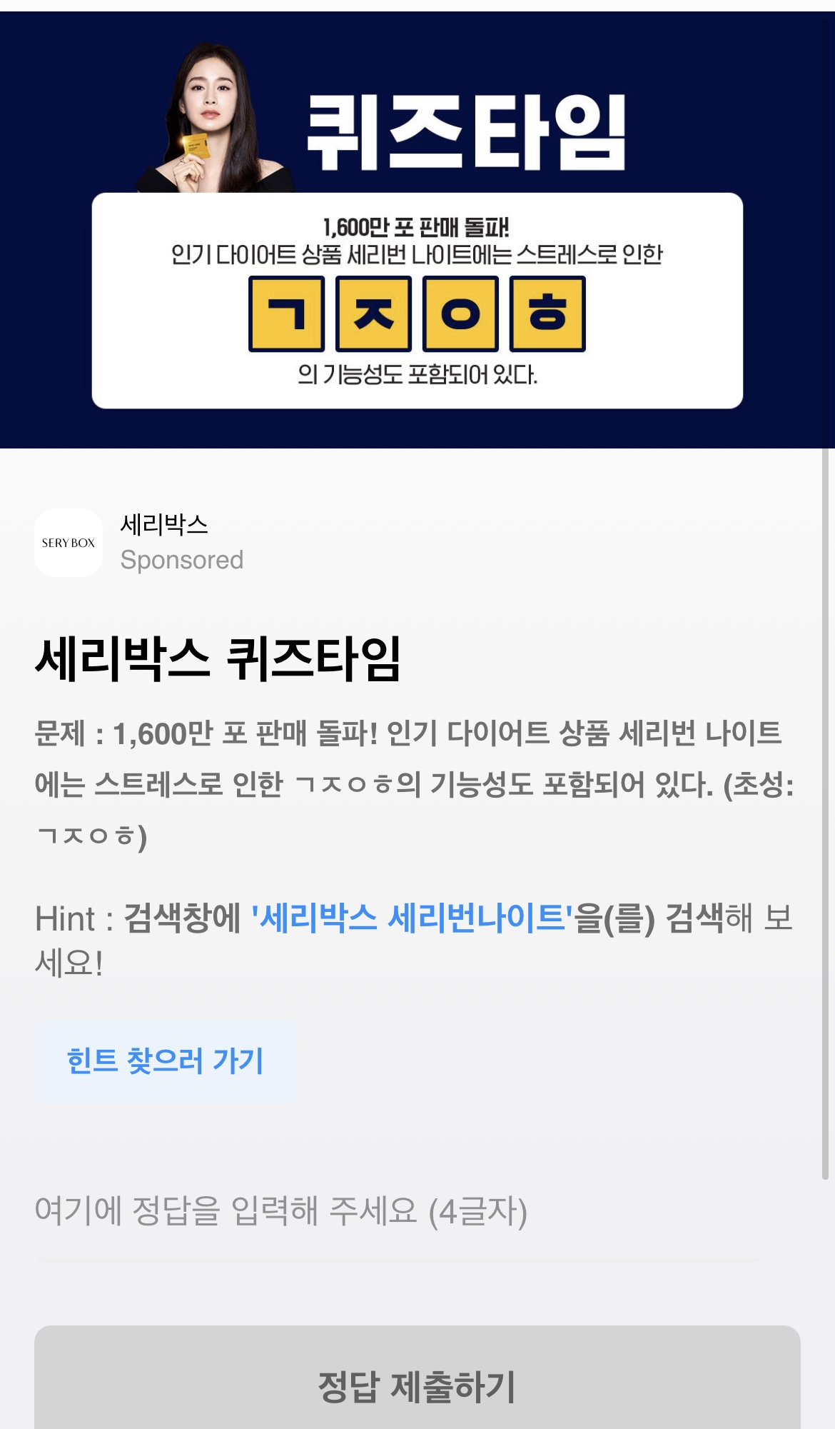 문제 : 잠들기 전 한 포 섭취 다이어트 완성, 세리번 나이트에는 비타민B군 ㅂㅎㅊ 또한 함유되어 있다. (초성 : ㅂㅎㅊ)