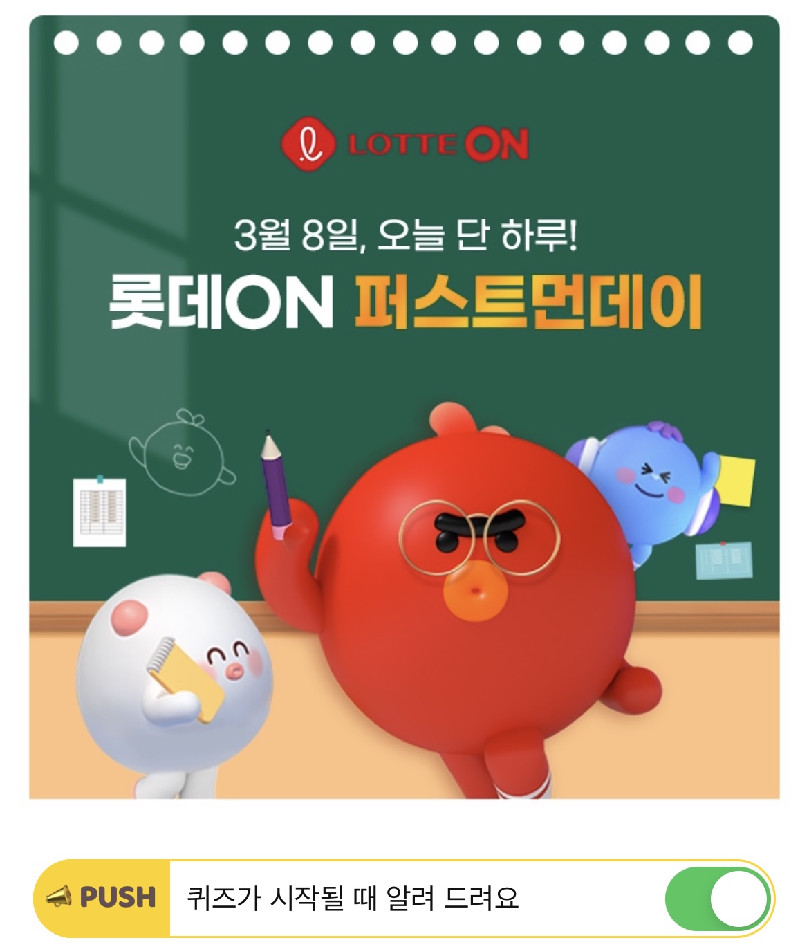 롯데ON 퍼스트먼데이에서는 OOO OOO를 저렴하게 구매할 수 있는 등, 24시간 혜택을 챙길 수 있습니다. OOOOOO에 들어갈 단어는 무엇일까요? (힌트 : ㅎㅈㅍㅇㄷㅎ)