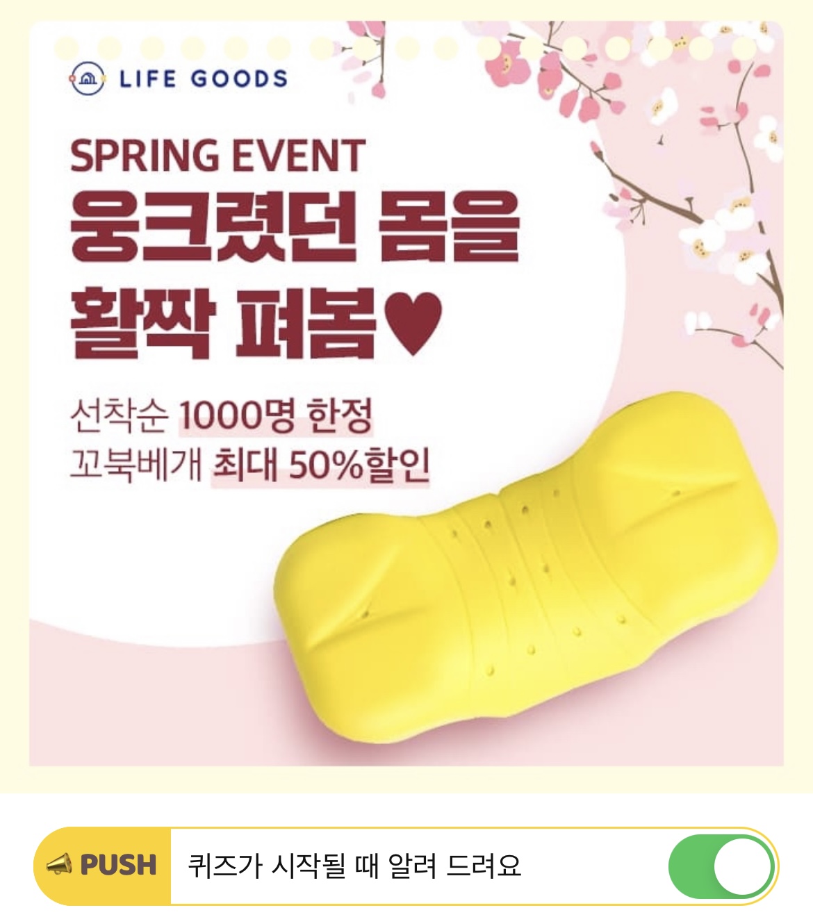 꼬북베개는 25만명이 선택한 기능성 oooo입니다. 빈칸에 들어갈 단어는 무엇일까요? (힌트 : ㄱㅊㅂㄱ)