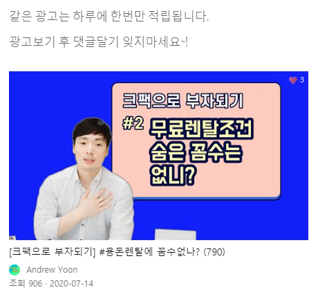 - 최근에 앱테크 어플들을 보면 리워드를 확 줄이거나 제한을 두어 얼마 이상 쌓이지 못하게 하는데 여기는 그런 것이 절대 없더라고요. 제가 처음 이용할 때부터 지금까지 변한 것이 하나도 없습니다. 용돈 랜탈이라는 서비스로 미리 돈을 지급해주고 광고를 보게 하는 방식도 그대로고 광고를 보고 댓글을 다는 것에 100원을 주는 것 또한 그대로입니다.