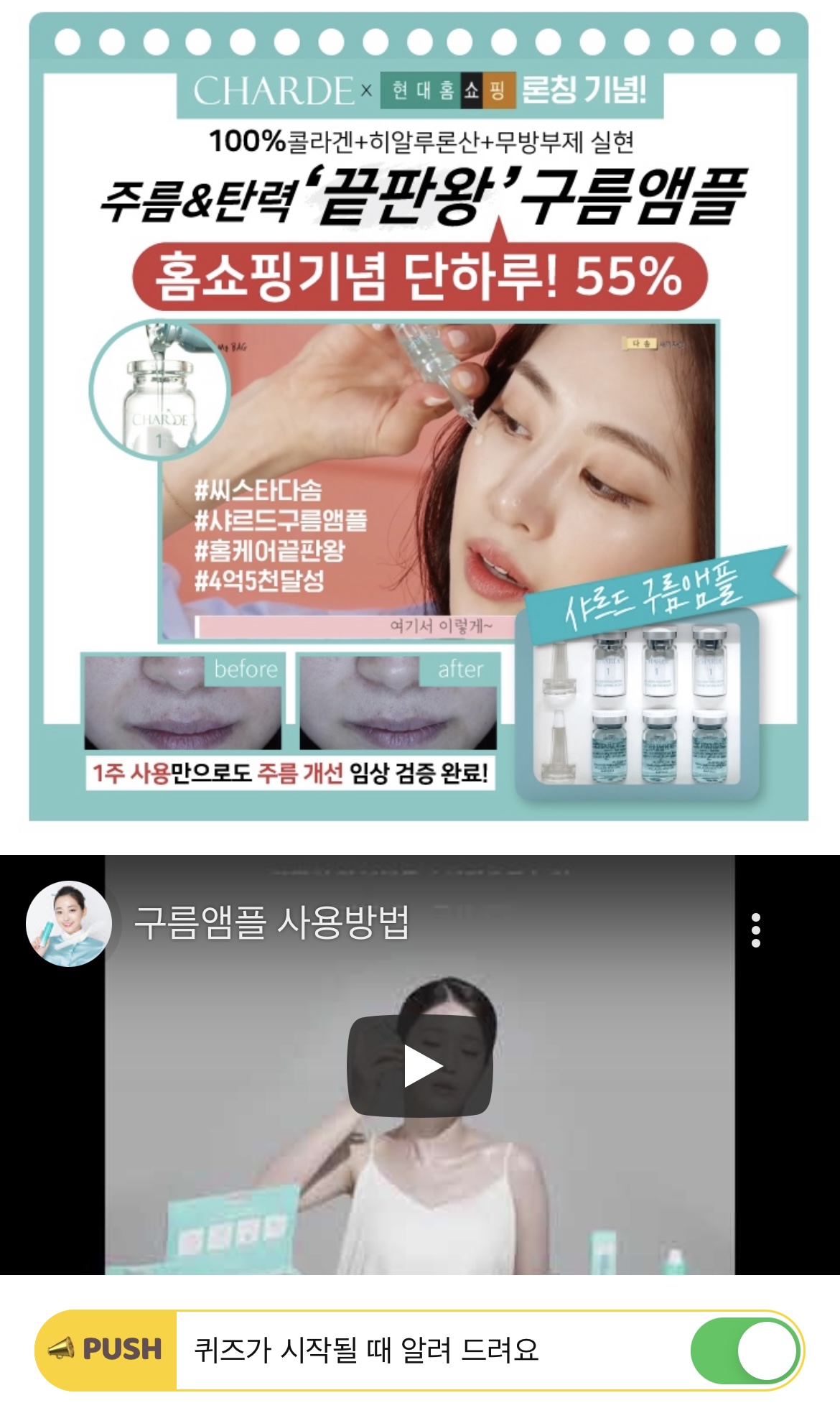 샤르드 구름앰플은 1주 사용만으로도 눈가, 이마, 팔자 3종 OOOO에 도움을 주는 앰플입니다. OOOO에 들어갈 단어는 무엇일까요?