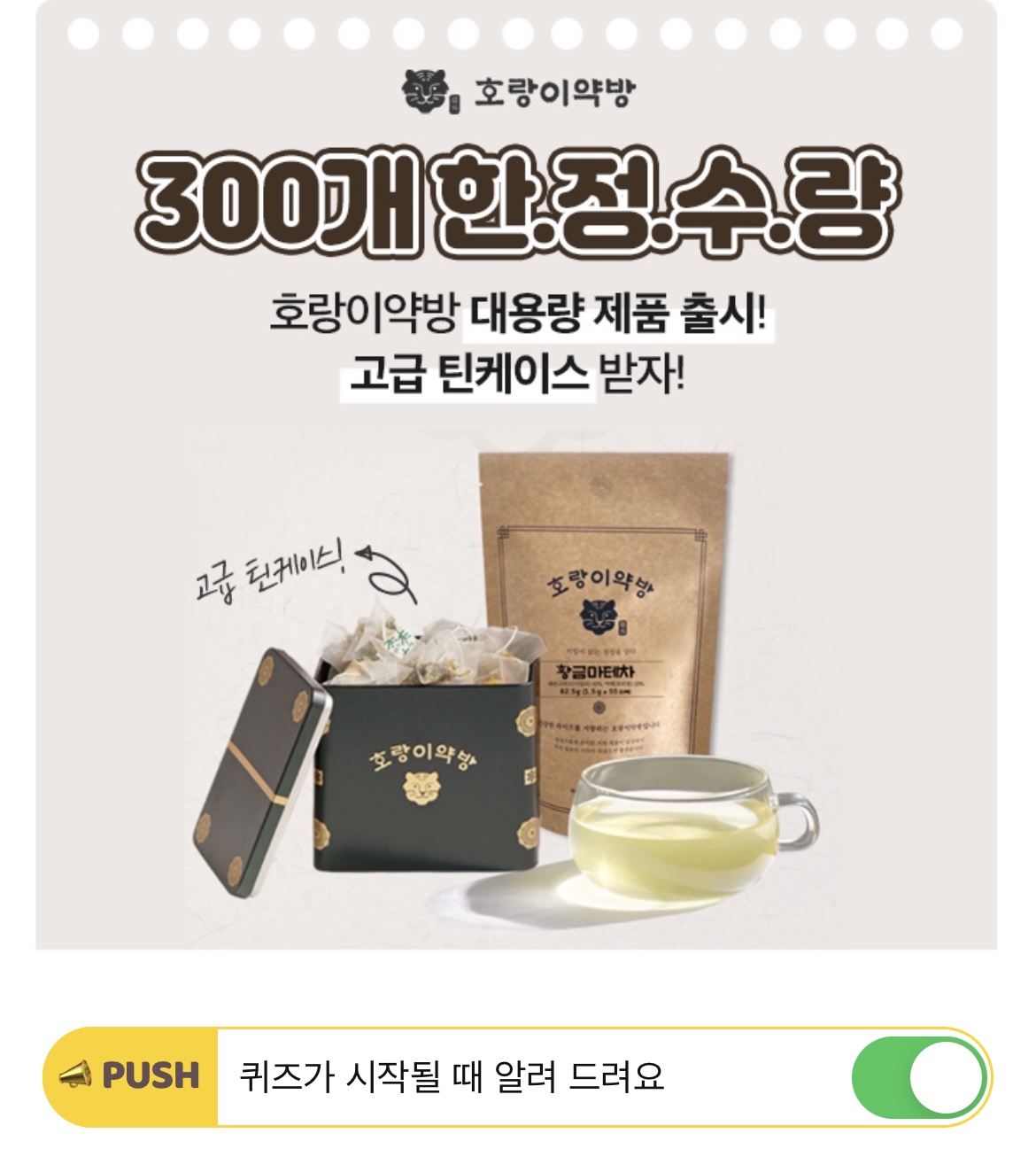 맥문동과 도라지 등 자연 원물로 고소하고 부드러운 목 넘김이 자랑인 호랑이약방의 대표적인 베스트셀러는 OOOO차입니다. OOOO에 들어갈 단어는 무엇일까요? (힌트 : ㅁㄷㄹㅈ)