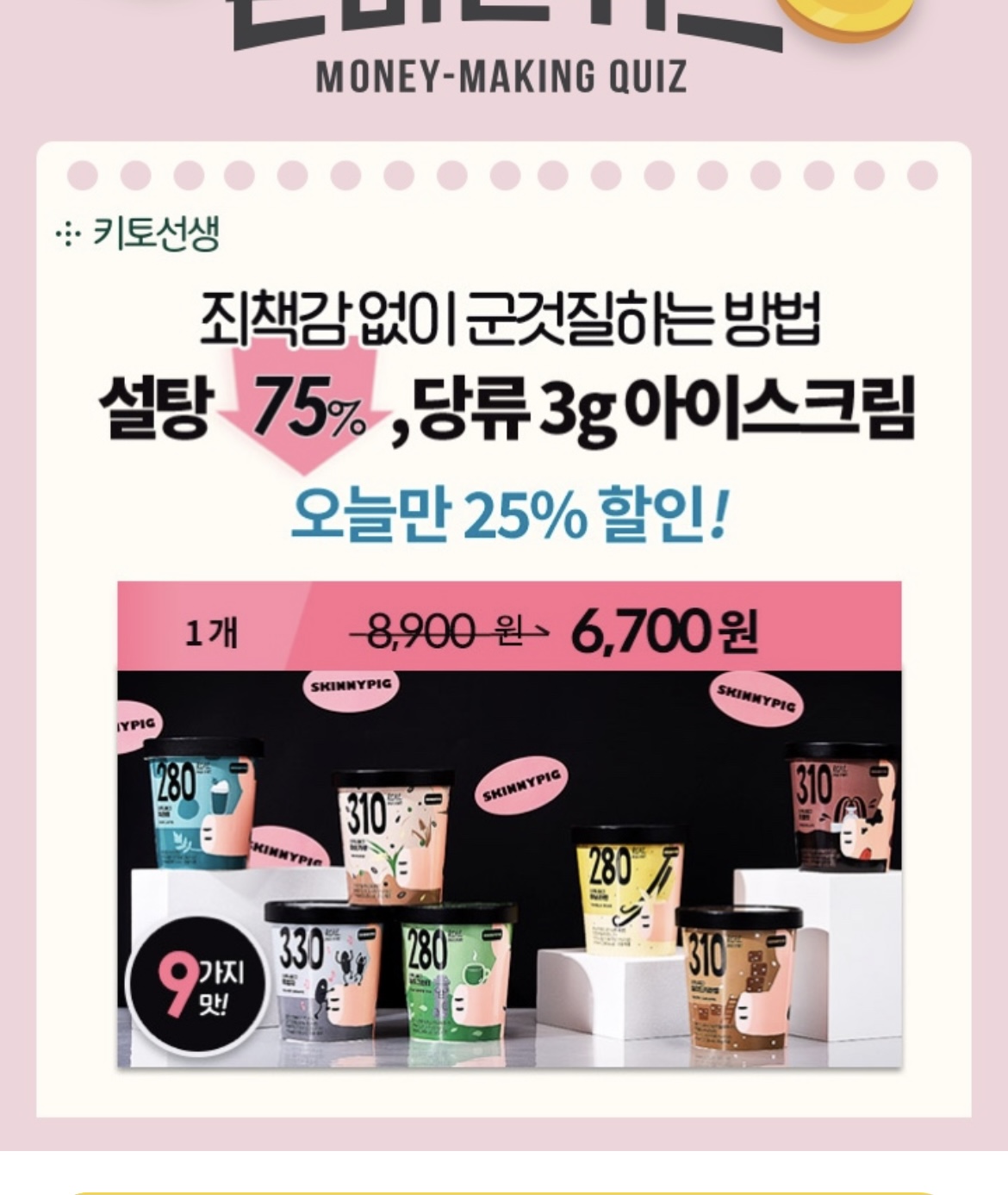 설탕 1/6, 합성첨가물 0%! 스키니피그 아이스크림은 설탕 대신 천연감미료를 사용하여 단맛은 그대로, 당 함량은 88% 낮춘 건강한 OO간식입니다. 빈칸에 들어갈 단어는 무엇일까요? (힌트 : ㅈㄷ)
