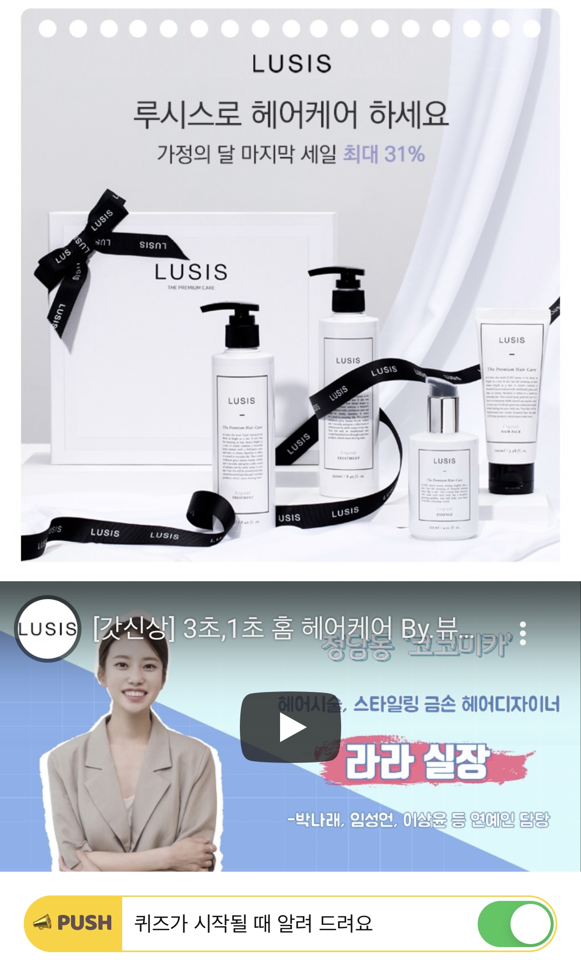 루시스 헤어 케어 제품은 헤어샵에서 OOO받은 것처럼 관리를 할 수 있습니다. OOO에 들어갈 단어는 무었일까요? (초성힌트: ㅋㄹㄴ)