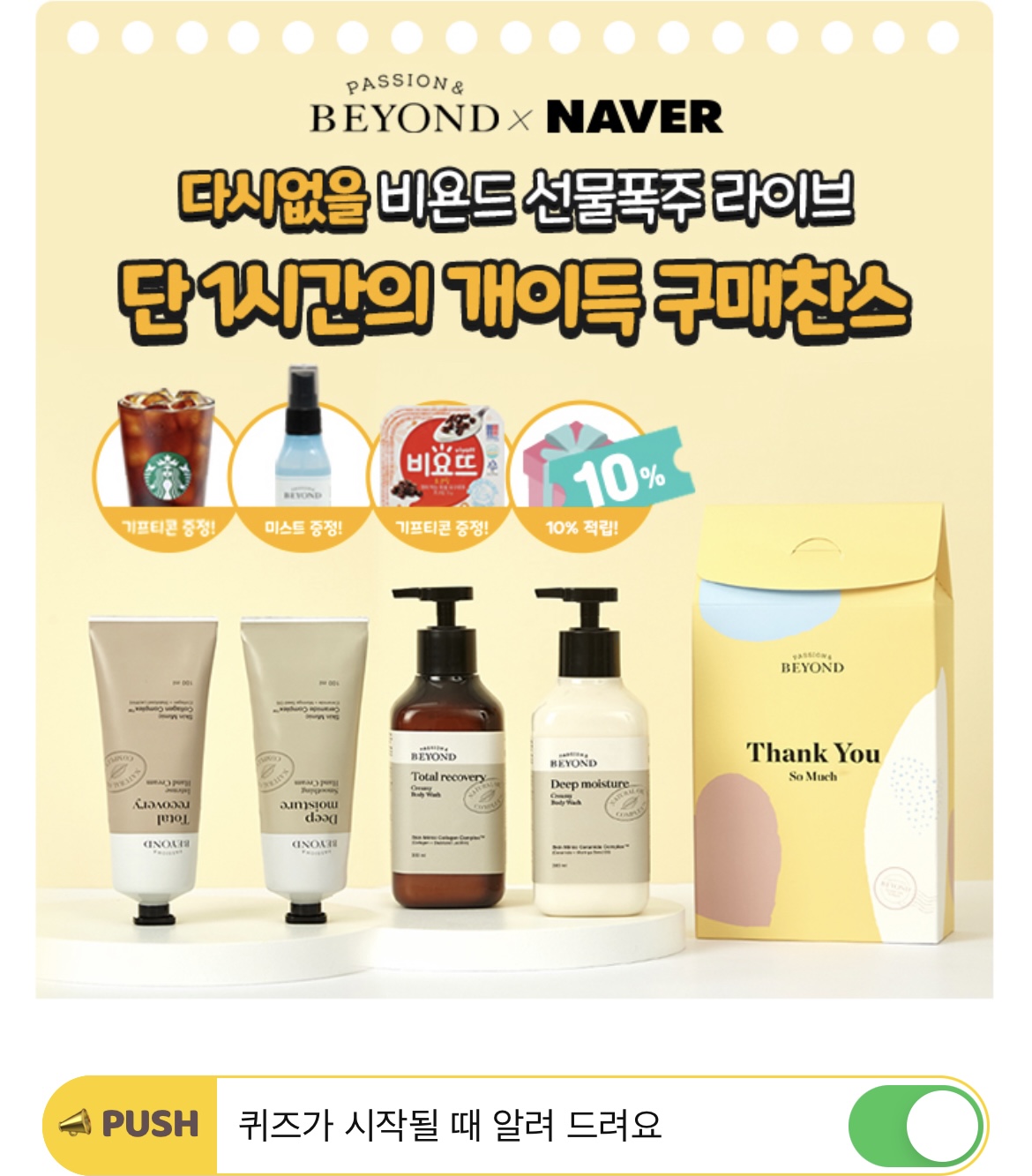 5월 26일 비욘드 라이브에서는 Deep3 보습케어로 촉촉함이 더해져 새로워진 OOOOO 스무딩 바디에멀전&OOOOO 크리미워시 기획세트로 실속 선물 특가를 준비했습니다. OOOOO에 들어갈 단어는 무엇일까요?
