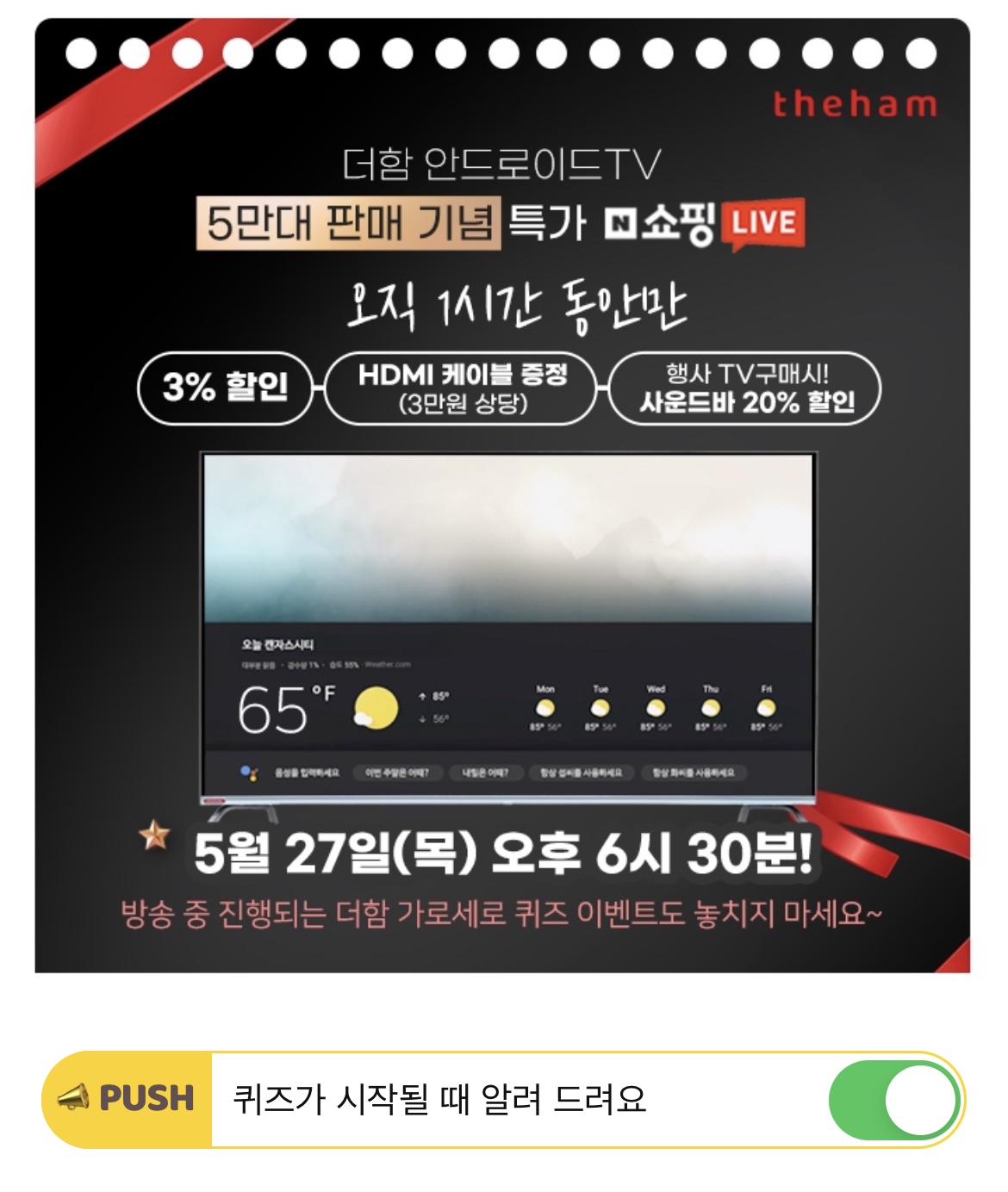 오늘 더함TV 쇼핑라이브는 더함 OOOOOTV 5만대 판매기념 특가로 진행됩니다. 빈 칸에 들어갈 단어는 무엇일까요?