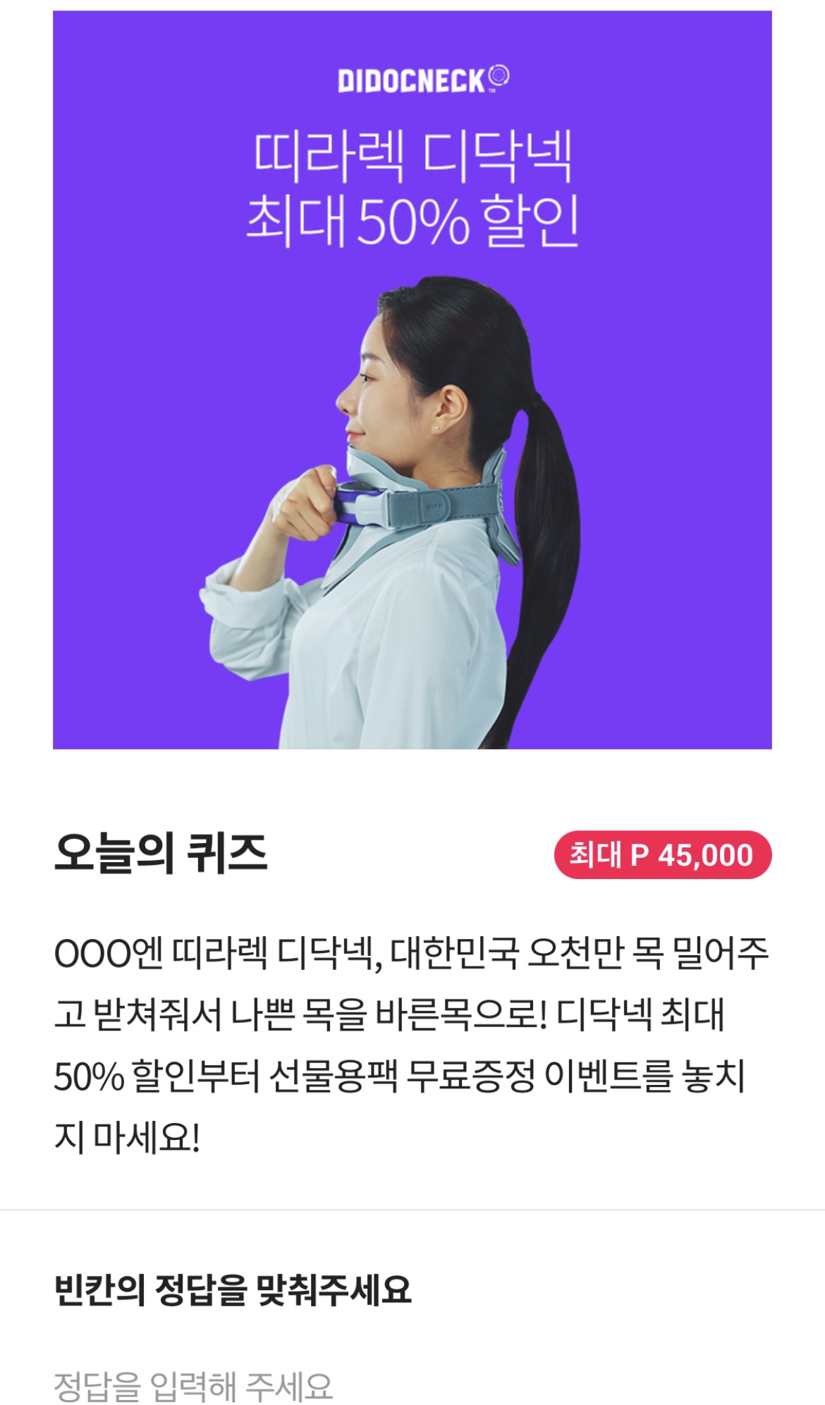 OOO엔 띠라렉 디닥넥, 대한민국 오천만 목 밀어주고 받쳐줘서 나쁜 목을 바른목으로! 디닥넥 최대 50% 할인부터 선물용팩 무료증절 이벤트를 놓치지 마세요!