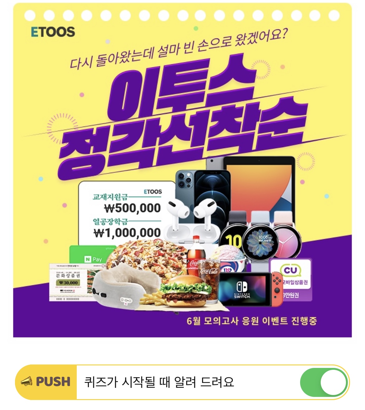 다시 돌아온 이투스 레전드 정각선착순 이벤트! 빠르게 채점하고 소문내면, 매 시간 OOOO를 이투스가 쏩니다! 야, 너두 당첨될 수 있어(요)! 여기서 OOOO에 들어갈 단어는 무엇일까요? (힌트 : ㅇㅍㅅㅌ)