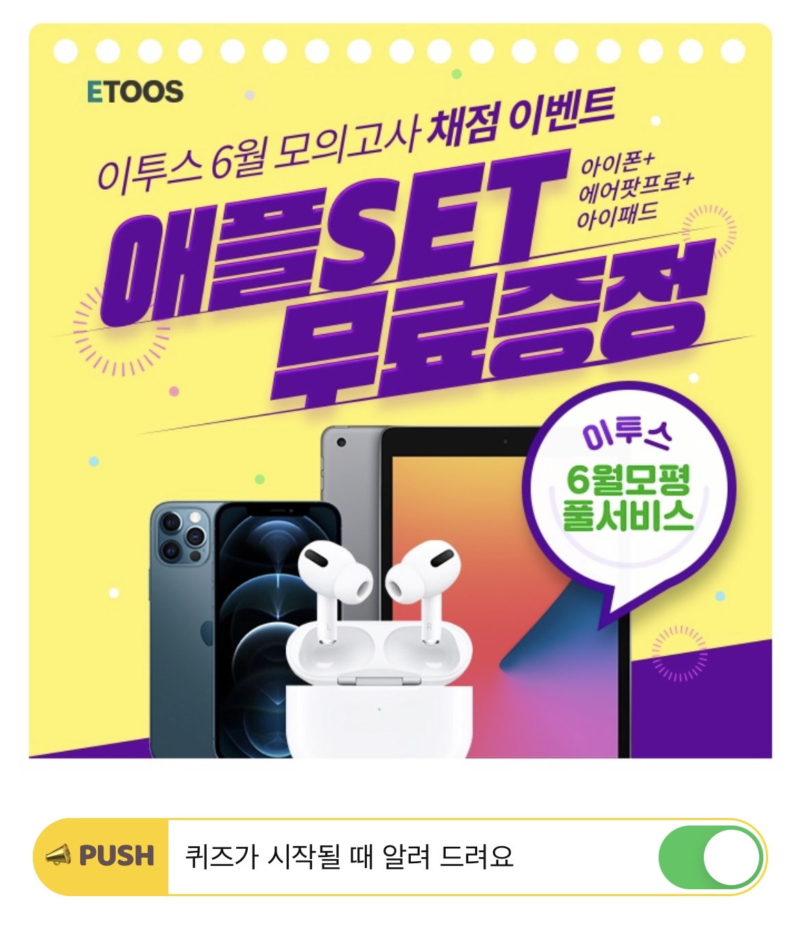6월 모의고사 후 이투스 OOOO를 이용하여 빠르게 채점하면, 바로 내 등급을 확인할 수 있죠! 등급컷 확인+채점하면 애플SET도 득템할 수 있는 이투스 모의고사 전체 서비스 이름은 무엇일까요? (힌트: ㅍㅅㅂㅅ)