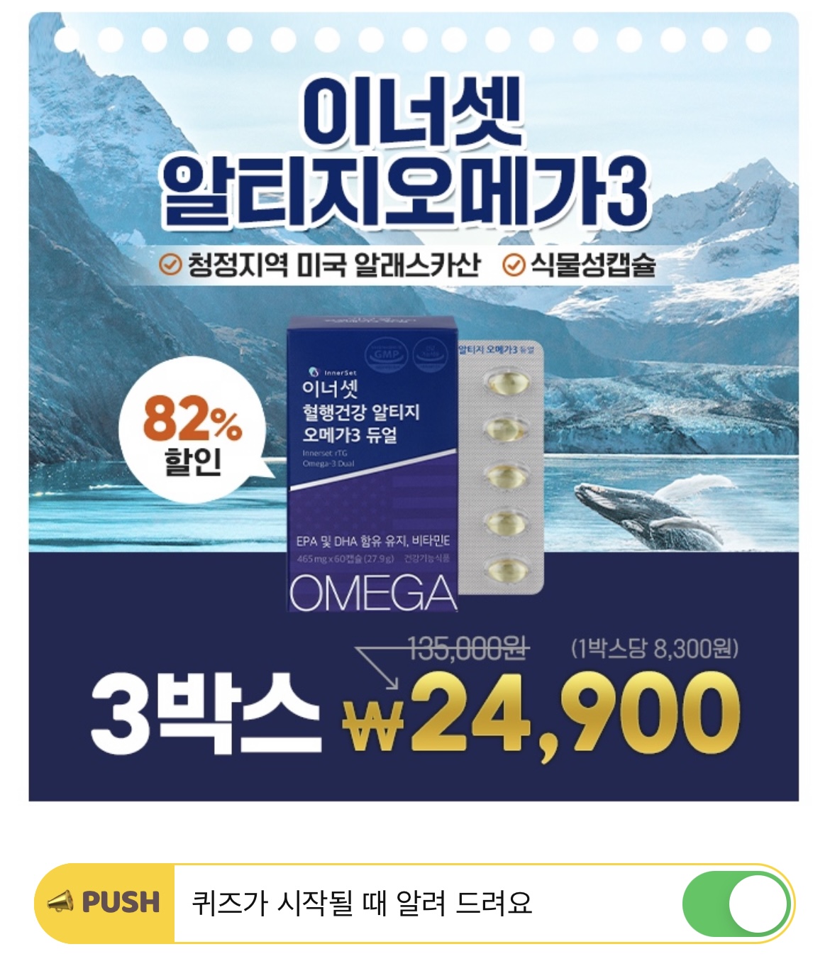 이너셋 알티지오메가3는 복합어종이 아닌 단일어종을 사용하며, 청정지역 알래스카 배링해협에 서식하는 OO을 사용합니다. 여기서 OO은 무엇일까요? (초성힌트 : ㅍㄹ)