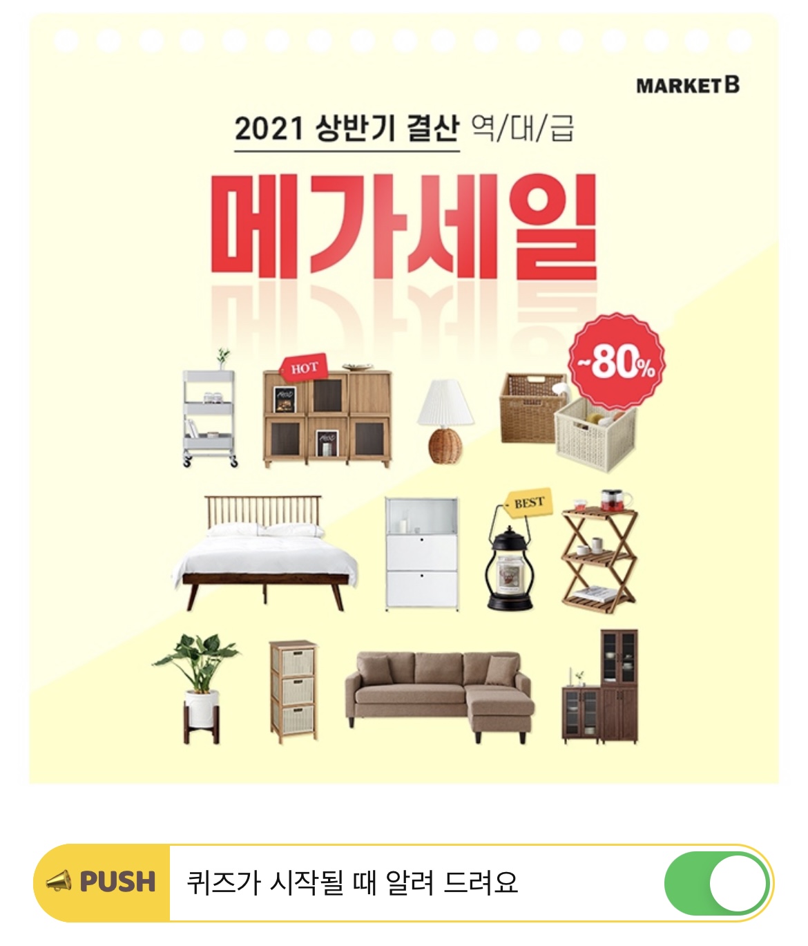 마켓비는 2021 상반기 결산 역대급 메가세일 기획전을 오픈했습니다. 최다 판매 BEST12 투표 이벤트를 비롯해 OOOO OOO TOP5, 최대 47,000원 혜택, 창고 대방출 80% 할인으로 알차게 구성했습니다. 빈칸에 들어갈 단어는 무엇일까요? (7자)