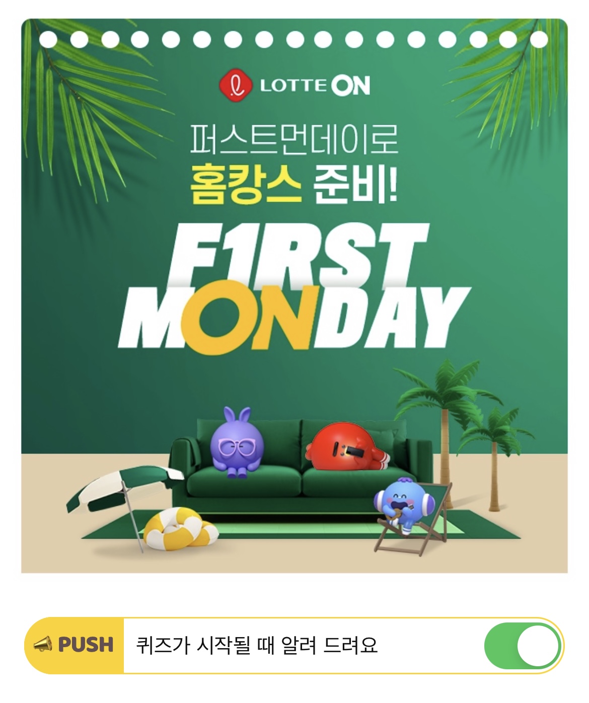 6월 퍼스트먼데이에는 '퍼먼쿠폰팩', 'OOOOO', 'L.POINT 적립' 혜택을 만나볼 수 있습니다! OOOOO에 들어갈 단어는 무엇일까요? (힌트 : ㅅㅍㅈㅇㄱ)