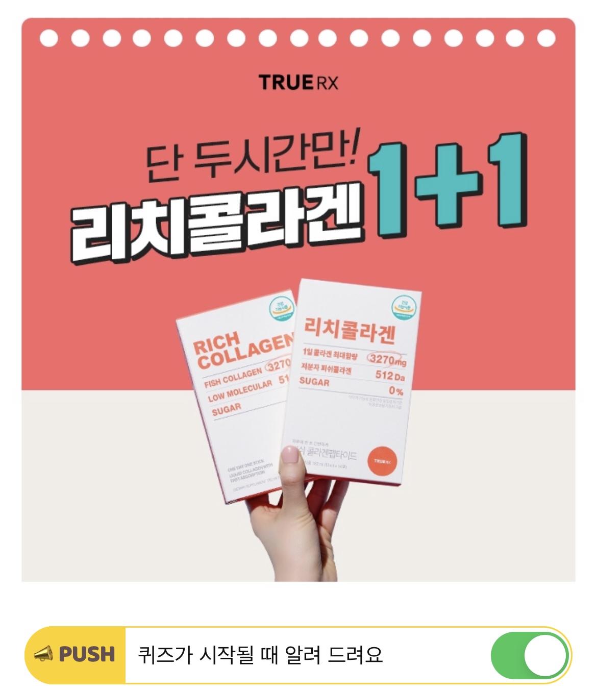 흡수율 좋은 100% 어린 콜라겐으로 만들어진 트루알엑스 리치콜라겐은 하루 1포로 식약처에서 인정한 피쉬콜라겐펩타이드를 OOOO으로 채울 수 있습니다. OOOO에 들어갈 단어는 무엇일까요? (힌트 : ㅊㄷㅎㄹ)