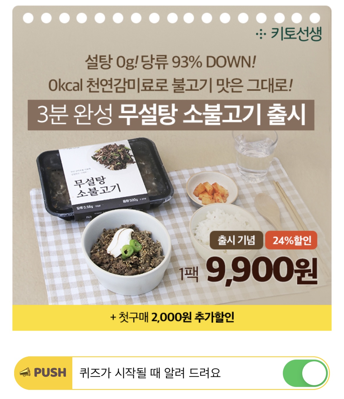 설탕 0g! 당류 93% DOWN! 키토선생의 무설탕 소불고기는 천연감미료와 야채로 단맛과 OOO을 더욱 끌어올려 온가족이 건강하고 맛있게 즐길 수 있습니다. 빈칸에 들어갈 단어는 무엇일까요? (힌트: ㄱㅊㅁ)