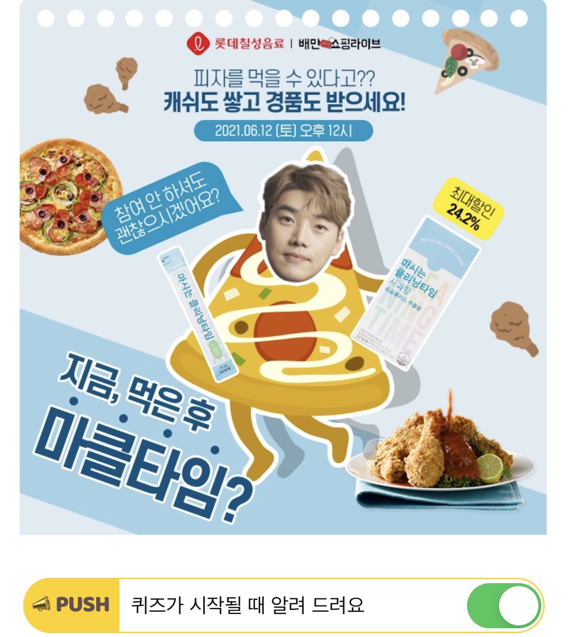 롯데칠성음료의 신제품 '마시는 클리닝타임 사과향' 은 맛있는 음식을 섭취한 후에도 OOO OOOO를 할 수 있도록 도와주는 건강기능식품인데요. OOOOOOO에 들어갈 답은 무엇일까요?