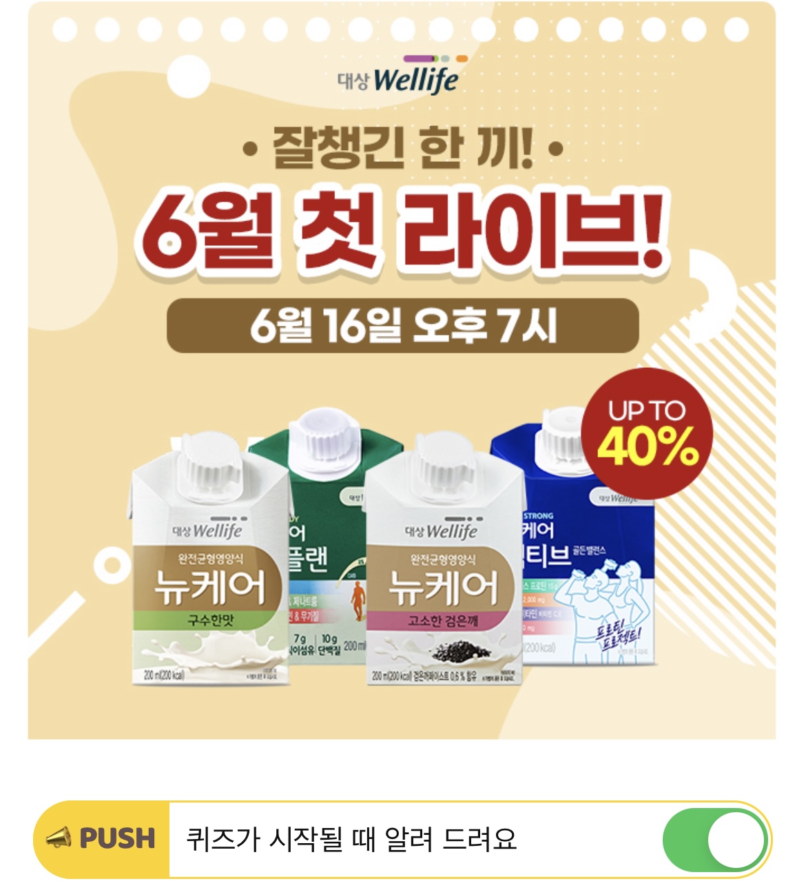 6월 라이브 첫 할인과 사은품까지 받아갈 수 있는 기회! 퀴즈풀고 캐시도 받아가세요. OOO에 들어갈 내용은 무엇일까요?