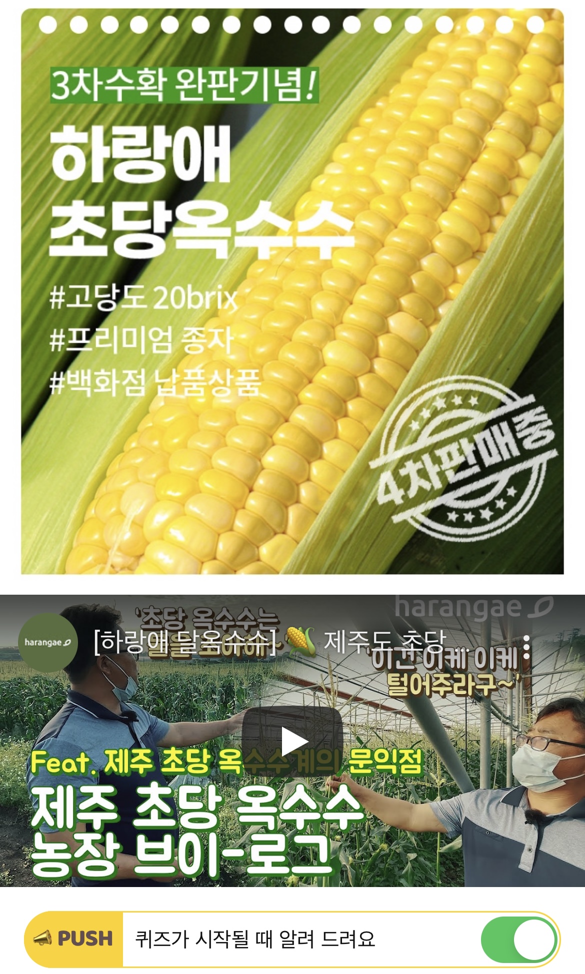 하랑애에서 판매되는 OOOO는 시중에서 판매되는 일반 초당옥수수와 다르게 품종을 개량하여 끝맺음이 꽉 차 있으며, 수분 함량이 높아 과일같은 식감과 풍부한 과즙이 특징입니다. OOOO는 특허명으로 오직 하랑애에서만 구매할 수 있습니다. 3차 수확 수량까지 완판되어 현재 4차 수확 판매가 진행중인 하랑애 초당옥수수의 특허명은 무엇일까요?