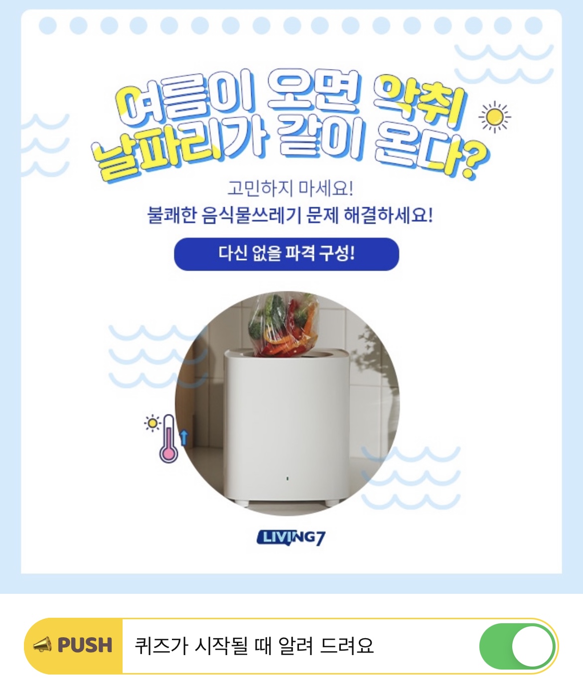 리빙7 음쓰쿨장고는 시원한 OOO OOO OOO입니다. 빈칸에 들어갈 단어는 무엇일까요? (힌트 : ㅇㅅㅁㅆㄹㄱㅊㄹㄱ/9자)
