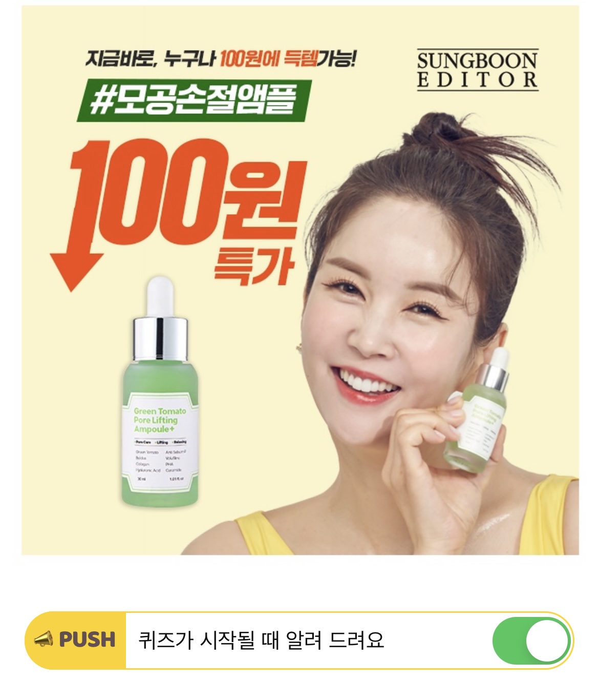 성분에디터 모공손절앰플을 구매하시면 모공 손절율 100%를 보장받을 수 있습니다. 모공손절앰플은 1회 사용만으로도 모공면적 OO%를 줄여준다는 임상시험을 완료했습니다. OO에 들어갈 숫자는 무엇일까요? (힌트 : 유튜브 영상 제목을 눌러 정답을 확인해보세요)