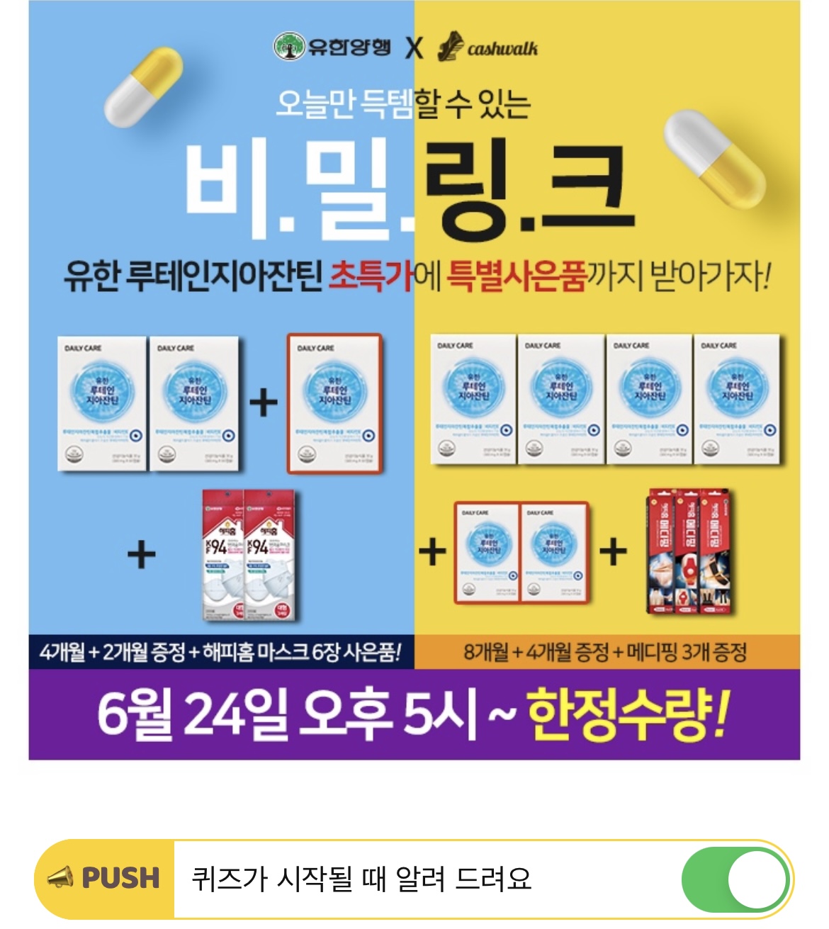 | 동국제약 식물성오메가3 ㅁㅅㅈㄹ 캐시워크/캐시닥 돈버는퀴즈 정답 6월24일 9시 (0) | 2021.06.24 |