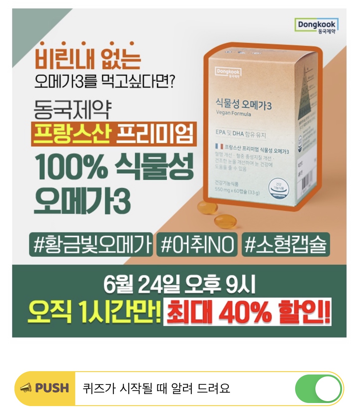 중금속과 각종 해양오염이슈로부터 안전하며 잔류용매 걱정없는 OOOO 오메가3! 동국제약 식물성 오메가3로 시작하세요!