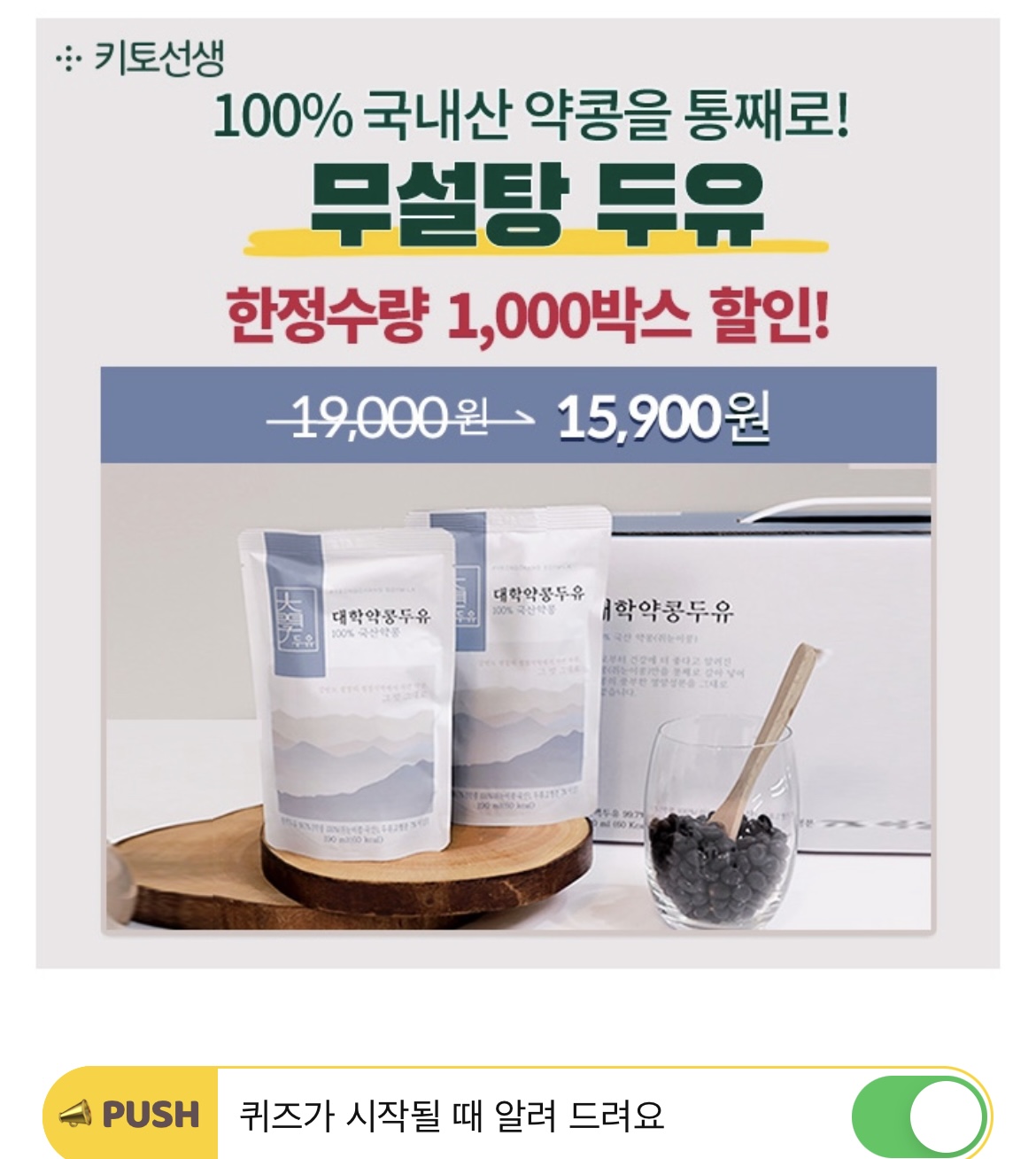설탕0g! 포만감100%! 대학약콩두유는 설탕이 들어가지 않아 약콩의 고소한 맛이 더 살아나고 바쁜 아침, OOOO으로 간단하고 든든하게 마실 수 있어 좋아요. OOOO에 들어갈 단어는 무엇일까요? (힌트: ㅅㅅㄷㅇ)
