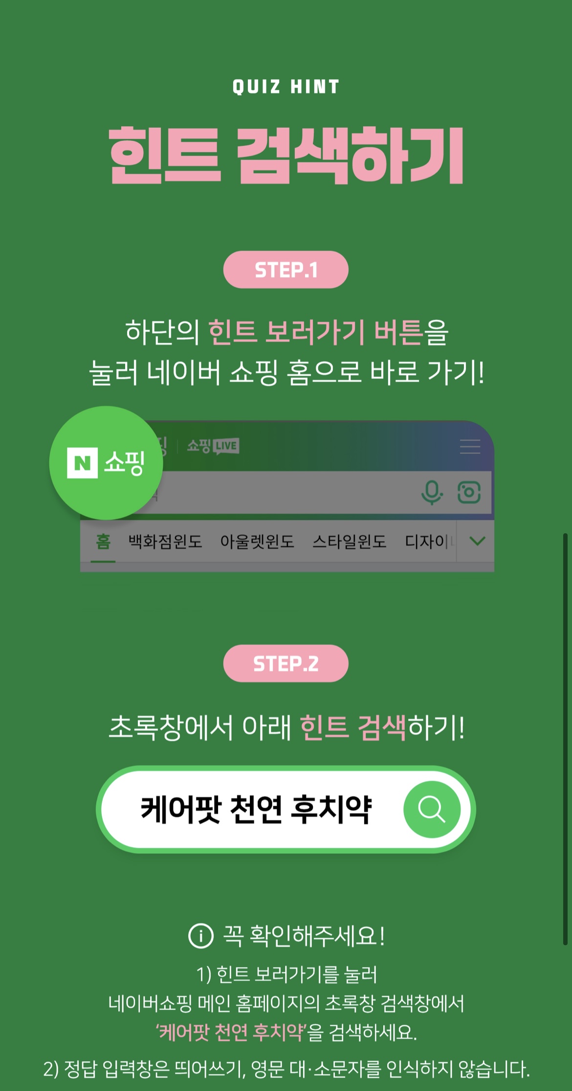 1) 힌트 보러가기를 눌러 네이버쇼핑 메인 홈페이지의 초록창 검색창에서 '케어팟 천연 후치약'을 검색하세요