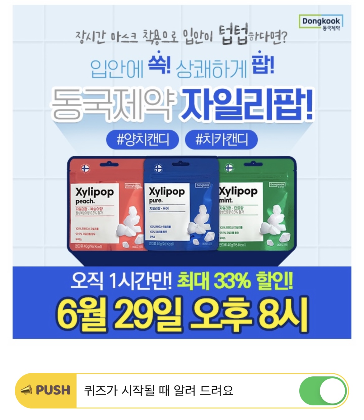 100% OOOO 천연 자일리톨로 만든 동국제약 자일리팝으로 장시간 마스크 착용도 상쾌하게! OOOO에 들어갈 단어는 무엇일까요?