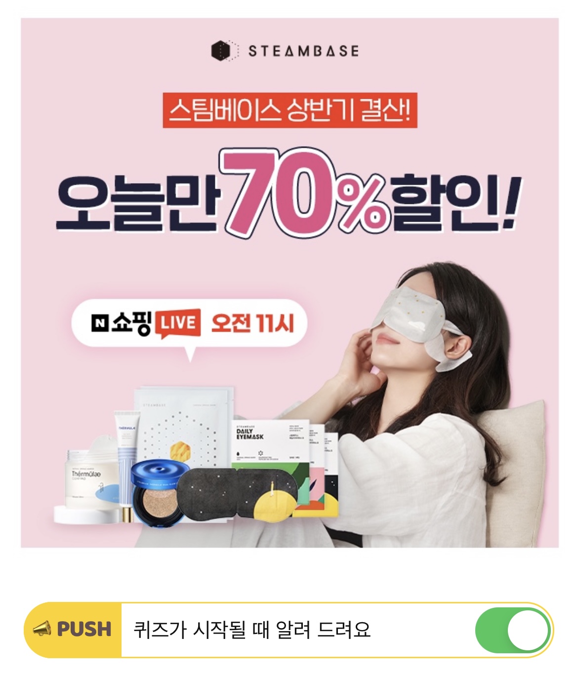 일명 OOO안대로 불리는 스팀베이스 데일리 아이마스크는 건조한 눈을 촉촉하게 하는데 도움을 주고, 쉽게 잠들지 못하는 프로 불면증러에게 꿀잠을 주는 아이템 입니다. 이 제품은 정제수 대신 OOO가 함유되어 눈에 풍부한 미네랄 스팀을 전달하는데요. 데일리 아이마스크의 정제수 대신 함유된 OOO는 무엇일까요? (힌트: ㅇㅊㅅ)