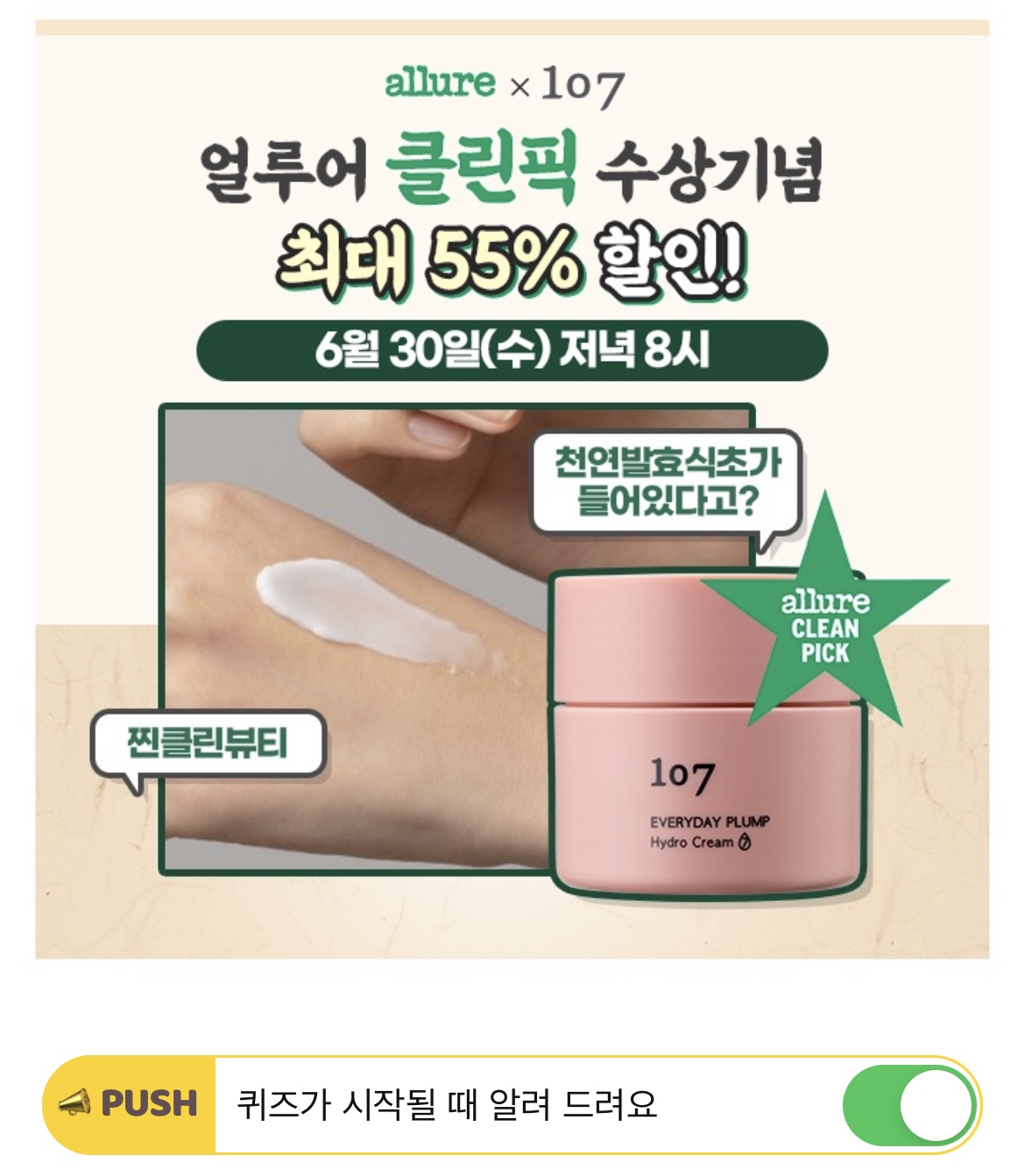 피부에 안 좋은 성분은 빼고, 순한 성분으로 만들어진 화장품을 OO OO라고 합니다. 뷰티 브랜드 107은 얼루어에서 깐깐하게 선정한 찐 OO OO 브랜드입니다. 빈칸에 들어갈 단어는 무엇일까요?